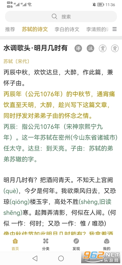 非常实用的学习古诗文的软件,有着大量的资源可以免费享用,每个诗词我们可以去查看译文,可以查看注释,还可以查看赏析,更好的去学习和理解这些古诗文,有需要的朋友可以下载试试。