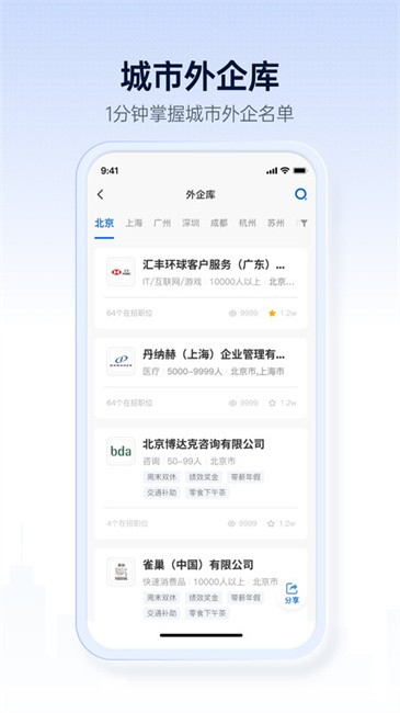 找工作新解法,每一家优质的公司都值得被看见,1分钟掌握意向城市外企名单,找到你的心仪雇主,已更新北京,上海,广州,深圳,成都,杭州,苏州,南京,武汉,西安,重庆,青岛,郑州,天津...99+城市外企招聘机会