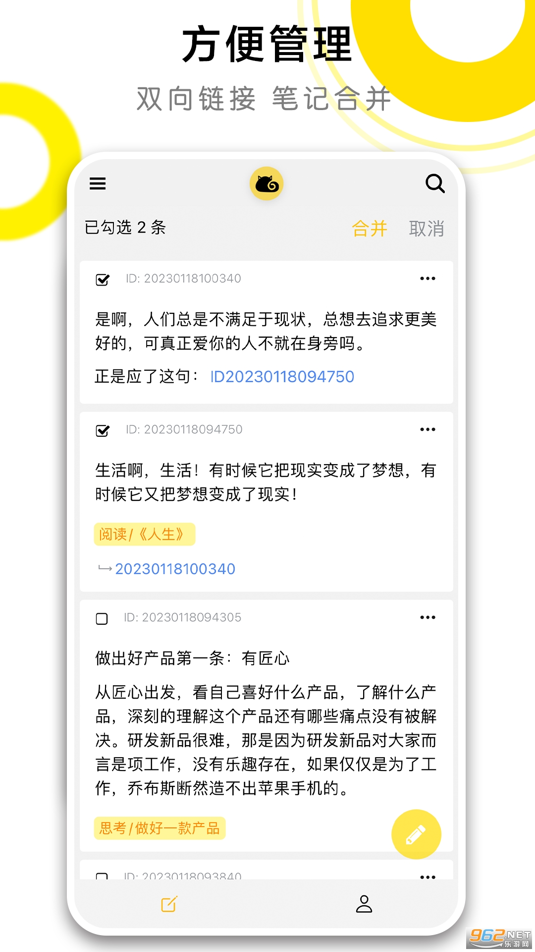 《CatNote卡片笔记最新版》为用户提供了一款高效的学习和工作软件,集成了卡片笔记、备忘录和日记便签等多种实用功能。这个应用让你可以轻松地记录、管理和整理自己的记忆和信息,不论是学习笔记、待办事项,还是个人日记,都可以在这里便捷地处理。让我们深入了解一下CatNote的特色、功能以及用户评价。