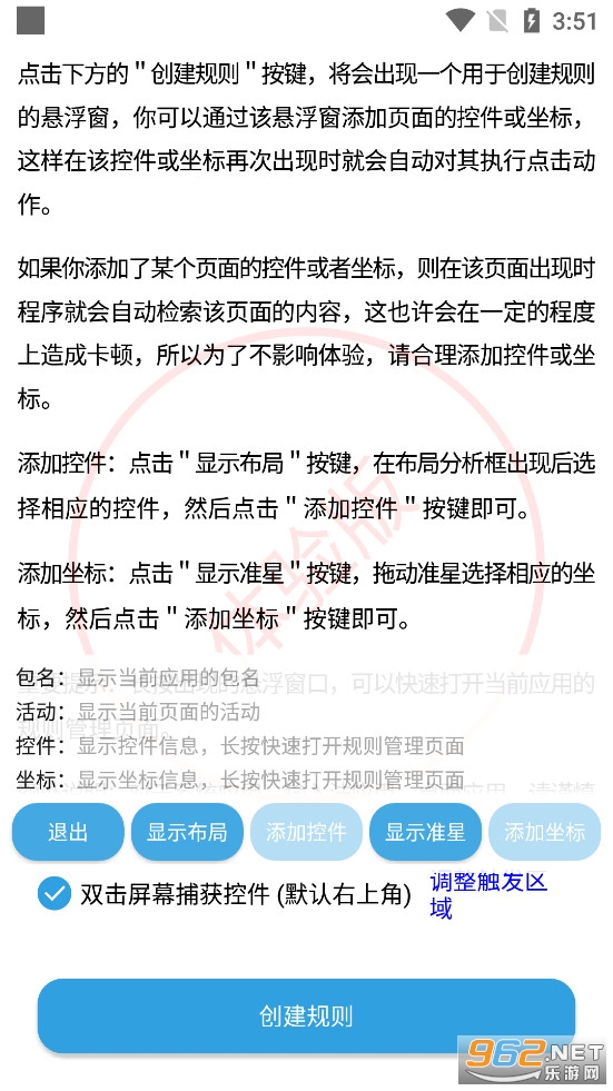 长按悬浮窗,跳转到当前应用的规则管理页面,查看或编辑刚才创建的坐标规则;