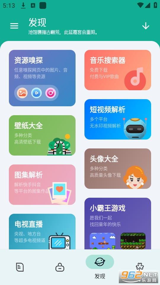 内置有蓝奏云软件库、资源嗅探、音乐搜索器、壁纸大全、短视频解析、图集解析、头像大全、电视直播、小霸王游戏等工具。