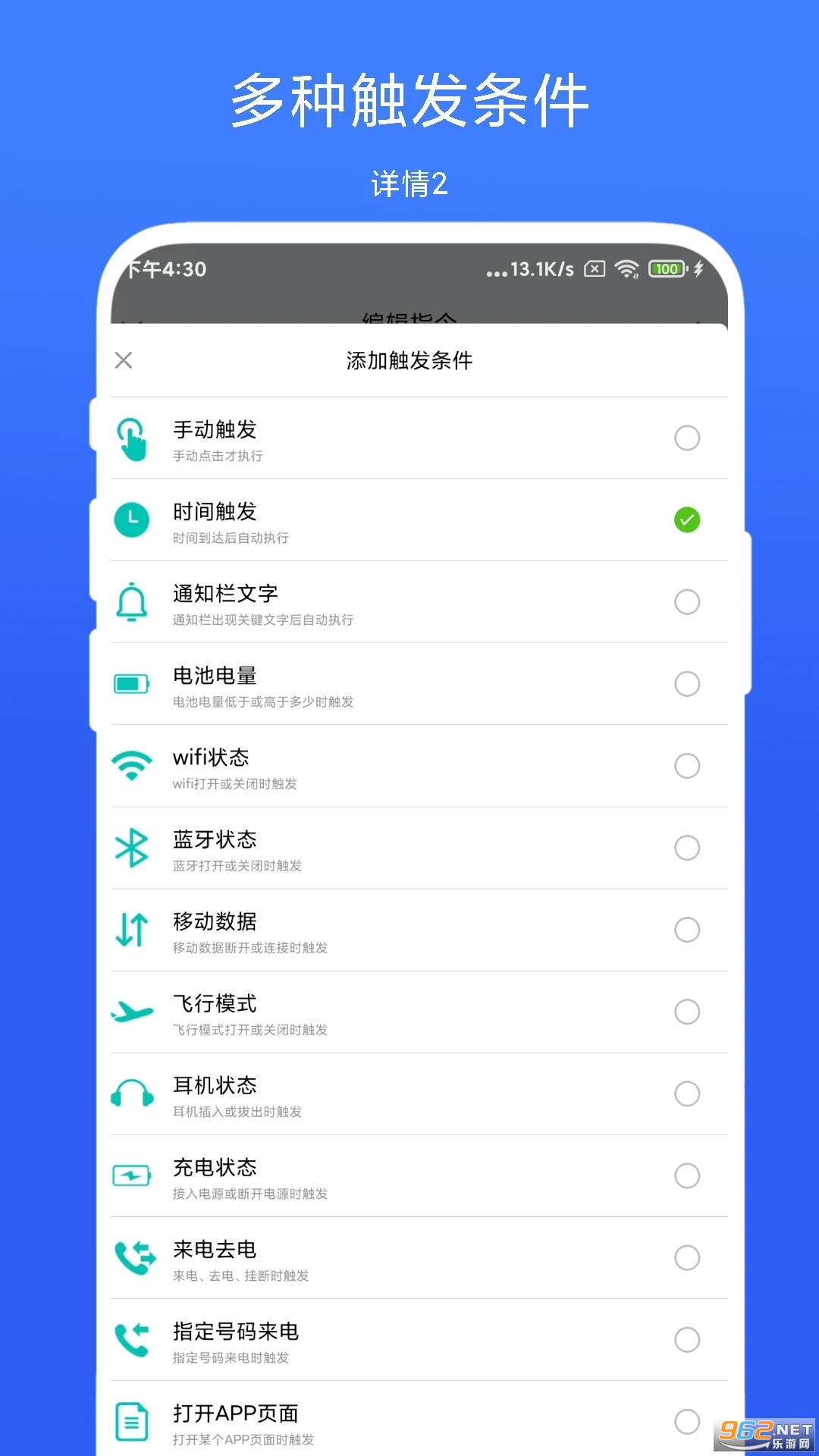 一款手机智能场景触发器APP,用户可以设置手机某个场景下自动执行某些动作。比如:定时打开和关闭飞行模式、手机电量低时自动调整屏幕亮度、插入耳机时自动减低手机音量、摇一摇手机自动打开扫一扫功能……软件内置了多个触发条件和触发动作,用户只需要进行自由组合即可。