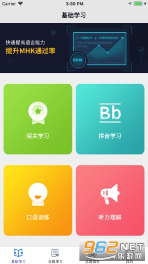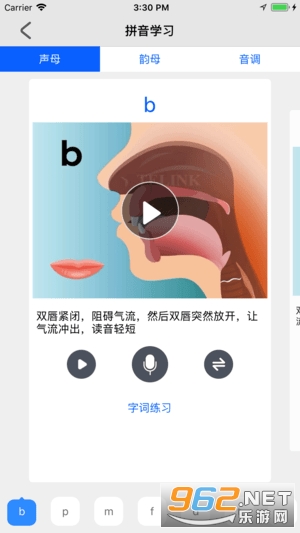 分为基础学习和常见语音问题学习。用户可以在基础学习模块中进行声韵调的学习,系统提供标准音带读,用户朗读完成后,系统会进行评测,并把朗读的语音进行反馈,相当于有一个老师进行指导。