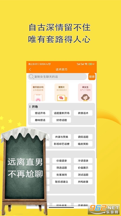 聊天话术回复神器是一款拥有海量免费情感知识的干货分享平台,教你如何与心仪的Ta聊天。让聊天变得有趣,让你的形象变得更幽默!