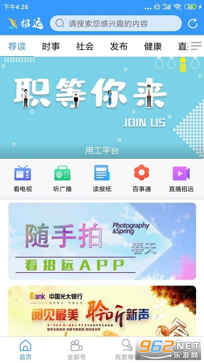 看招远app是一款为招远市的居民打造的融媒体移动平台,提供了全媒体投放、渠道聚合、城市服务等多种功能,让用户能够及时了解招远市的大小事情,包括新闻广播、视频直播、健康资讯、招聘求职等内容。