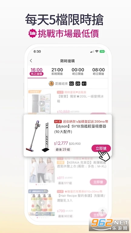2. 限时抢购:每天5档限时抢、每人限购3组,APP限定抢先提醒