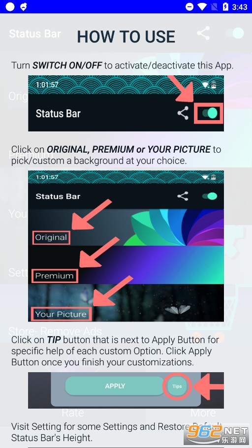 切换各种状态栏布局;增值版功能更加强大;自带详细的帮助信息