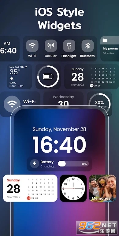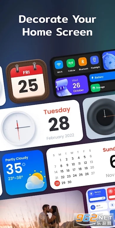《iWidgets》一款适用于所有 Android 设备的多样颜色小部件工具,提供了丰富的 iOS 16 风格的小部件,包括时钟、照片、X面板、日历和天气等,让用户能够轻松定制自己的主屏幕,让信息随时可见。多种小部件尺寸和样式使用户的屏幕变得个性化且充满活力。