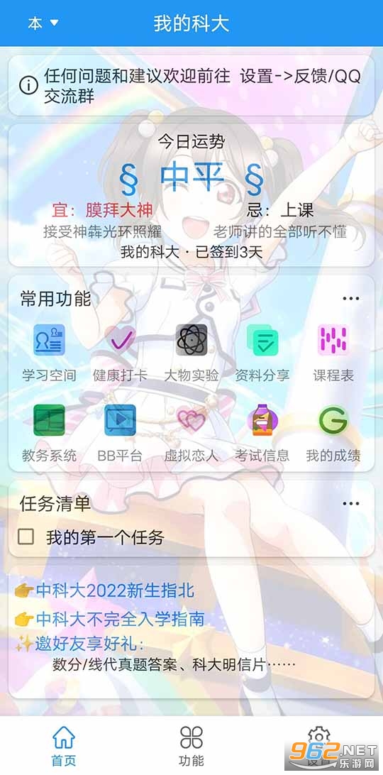 《我的科大最新版》这款专为中国科学技术大学学生设计的软件为校园生活提供了多种服务功能,从课程表和教室查询到休闲娱乐,从校园导航到虚拟恋人等,涵盖了丰富的应用领域。软件强调便捷高效,提供密码加密存储、一键导入课程表等功能,同时界面美观且支持深色模式,为学生们带来纯净的使用体验。更重要的是,该软件免费且没有商业广告,为中国科学技术大学的学生们提供了便捷和愉悦的校园生活辅助工具。