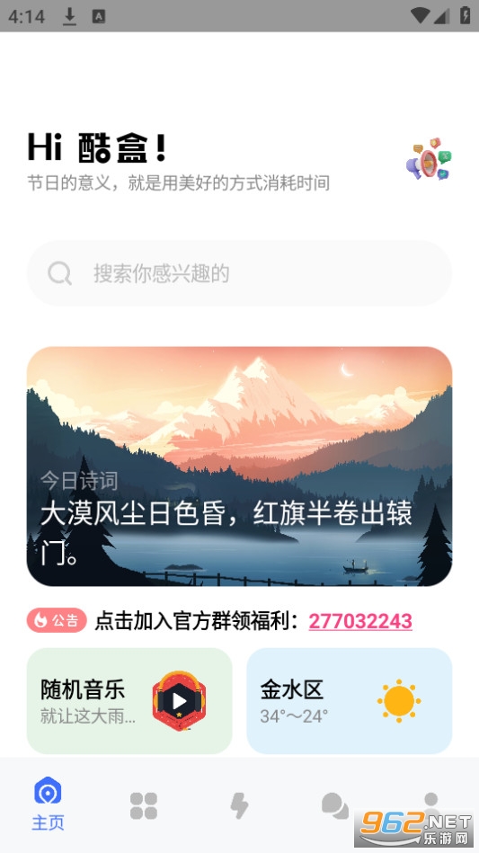 酷盒是一款集视频、音乐、直播、游戏等多项功能于一身的综合性平台,用户可以在其中找到海量的资源及各种好玩的娱乐内容。最新版本下载后,用户可以享受更为流畅、快捷、稳定的使用体验,更加方便地获取资源及进行娱乐消遣。酷盒是一款集视频、音乐、直播、游戏等多项功能于一身的娱乐综合平台,用户可以在其中完成大量的娱乐消遣需求。最新版本下载后,用户可以体验更为流畅、快捷、稳定的使用体验,并且拥有更加丰富、多样化的资源。