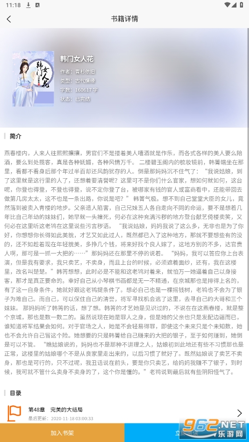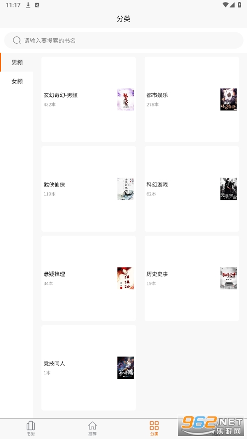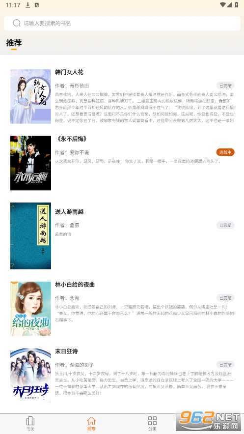 一款免费的小说阅读软件,可添加自己喜欢的小说到书架,每个小说有作者状态等介绍。可按分类查看。