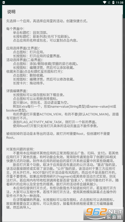 不要用本应用破坏其他应用的正常流程(如去广告、扫码、支付)。若其他应用打开了其他页面,有时功能会失效。常用软件通常自带了创建扫码相关快捷方式的功能。制作本应用的初始目的是打开系统设置中的某些隐藏项。