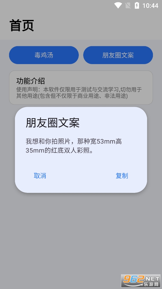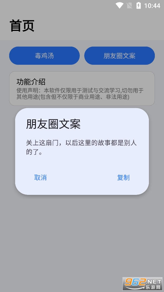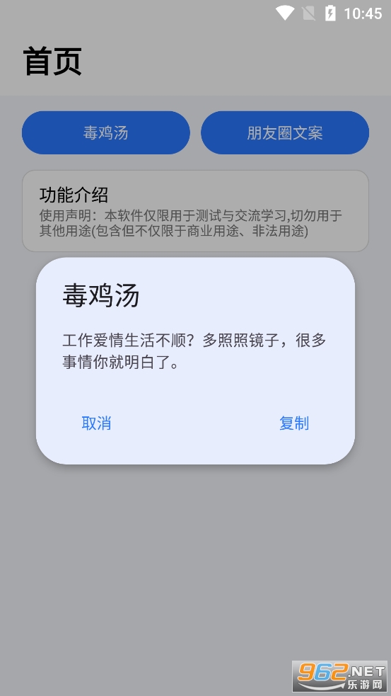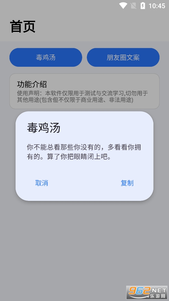 趣味的文案随机生成软件,可以自动生成各种各样的毒鸡汤和朋友圈文案,可以直接复制自己想要的文案去使用,不足的地方就是不能自己输入关键字来进行生成,有需要的朋友可以下载试试。