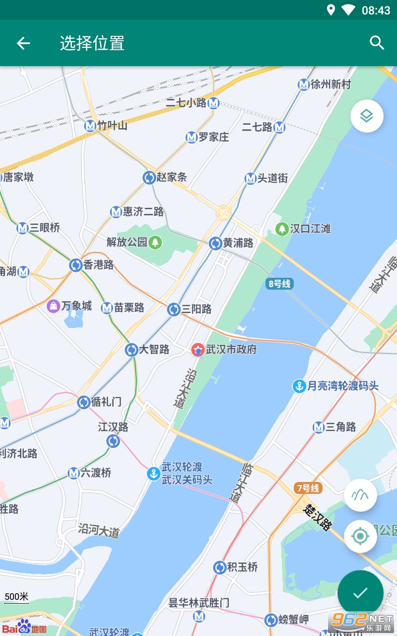 2、在地图中搜寻想要模拟的位置后点击右下角勾号按钮。