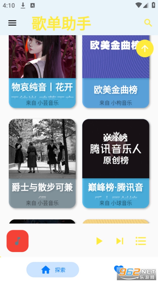 歌单助手手机版下载2026官方免费版是一款非常好用的手机音乐播放器软件,软件内为用户整理提供了丰富的音乐歌单,涵盖了各种类型以及风格的曲目,在这里用户可以在手机上一键播放各种曲风类型和特色主题的音乐内容,最重要的是软件中所有的音乐都是免费提供的,用户无需充值会员,喜欢的小伙伴快来下载吧。