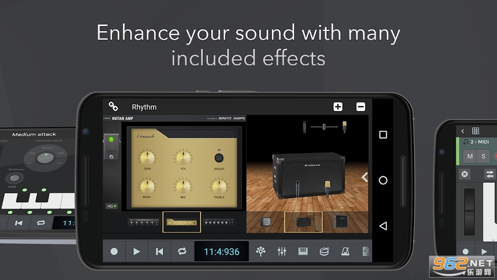 混响、回声、和声与 Flanger、Tremolo、音高调节、相位器、放大器和压缩效果可以添加到任何音轨与主通道上 *