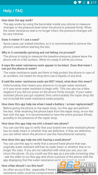 water resistance tester app是一款非常好用的手机防水性能检测工具,让您无需将手机浸入水中即可测试手机的 IP67/IP68防水性能。该应用程序使用内置气压计来检查您手机的防水密封是否完好无损,要测试您的手机,只需安装该应用程序并在标记区域用力按下手机屏幕。如果您手机的防水密封件完好无损,该应用程序将显示一个复选标记和一条消息。