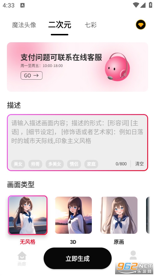 专业的ai智能绘画APP,通过软件生成各种不同特色种类的作品,直接和好友进行分享。简单的进行描述,就能够让你脑海中的画面成为现实,快来试试吧!