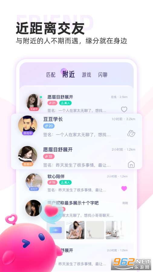 全新的同城匹配交友APP,力图打造全新概念的年轻人交友社区,无论是互动还是表达,这里总有一个属于你的空间,去记录当下的心情,今日的小事,此刻的发生。通过自我的表达引发出他人的共鸣,与其他有趣的人一起在这里畅想交心!