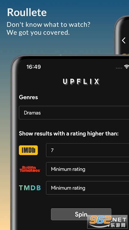 当您不知道要看什么时,轮盘模式可帮助您在 Netflix 上选择电影和连续剧。只需根据类别、IMDB 评分、TMDB 和烂番茄创建您的过滤器,Upflix 就会根据您的口味推荐一些内容。