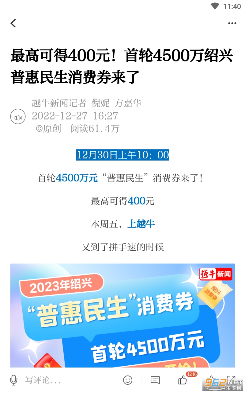 《越牛新闻抢消费券app》是一款非常不错的本地新闻服务软件,然后今日(2026年12月30日)早上10点开始抢消费券,一共1.5亿的消费券,本轮4500万元,进入客户端,找到消费券入口进去抢即可,十分的方便,感兴趣的亲们赶紧下载吧。