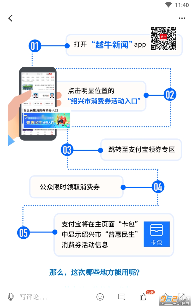 3.消费者打开越牛新闻APP,点击绍兴消费券返场活动入口,直接跳转至支付宝绍兴消费券页面,点击免费领取。