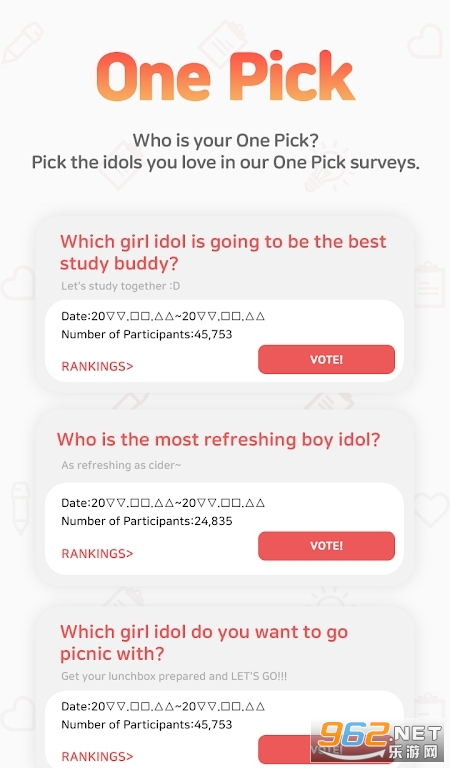 《最爱豆名人CHOEAEDOL Celeb》一款韩粉追星必备的应用,为粉丝们提供为爱豆投票的平台。用户可以直接向自己喜欢的偶像投票,实时排名也会反映投票结果。此外,软件还提供偶像日程分享、支持筹款活动、参与民意调查等功能,让粉丝们与偶像更加亲密互动。