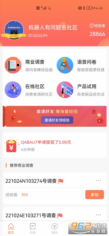 1、参加调查问卷、语音问卷、产品试用可以获得海量经验值;