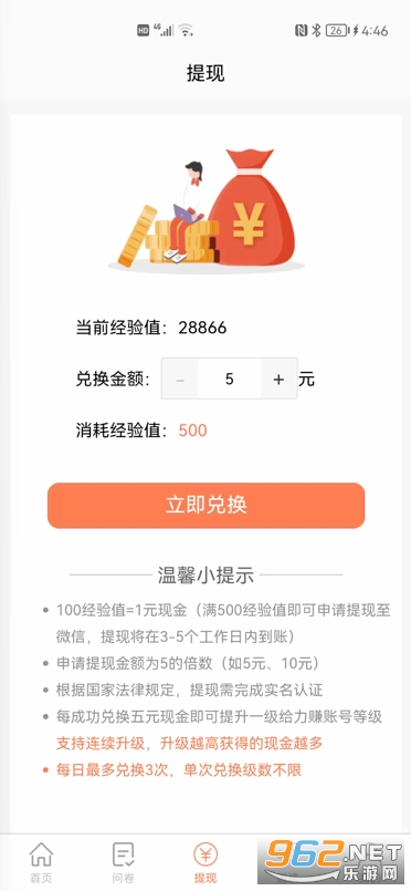 2、将经验值兑换成现金,通过提现中心的兑换功能把自己的经验值兑换成现金;