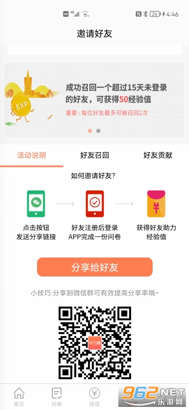 3、好友成功完成问卷并获得经验值奖励,您可获得该经验值奖励的20%;