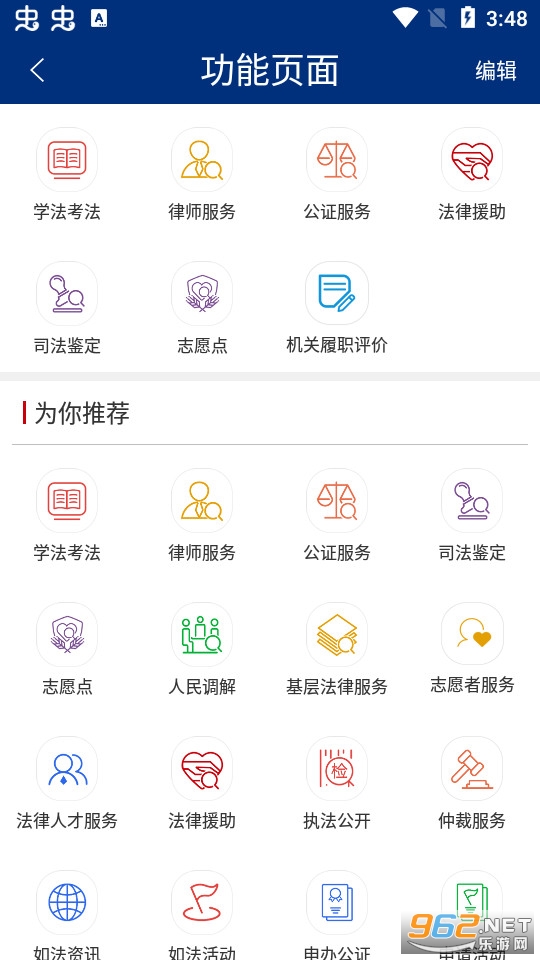 法律服务:在这里可以找律师、求援助、办公证、做鉴定、学法律、考法律、做调解、帮安置、查服务进度等。