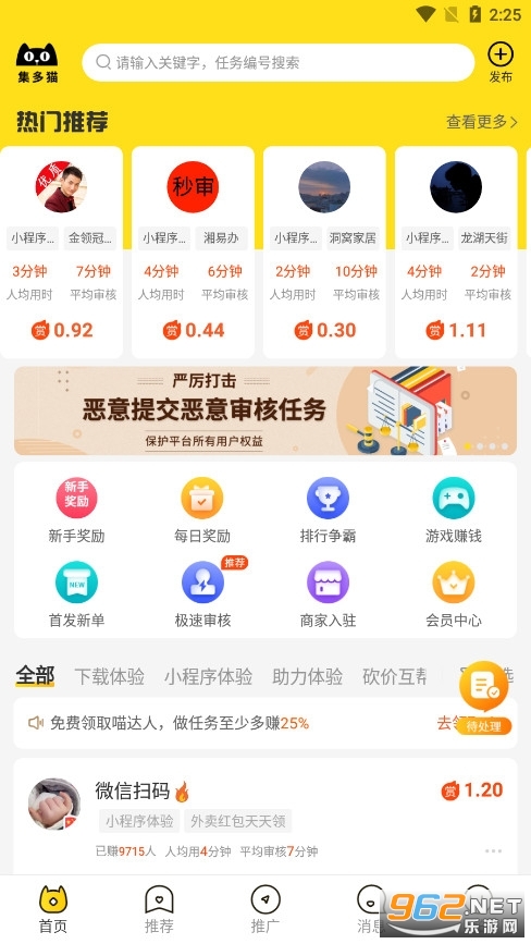 完成后打开app登录,然后到它的个人中心领取下喵达人特权,接着再到app首页或是极速审核接单做任务。推荐多做极速审核专区找众包任务做,因为这里边的任务佣金审核到账款,最迟不会超过1小时审核。悬赏主超时未审核的系统会自动审核,急于见到钱的小伙伴可以到极速审核专区找任务做哦。不要担心不会做任务,因为每个任务都有详细的做单步骤和说明,跟着步骤和说明去完成就行了,集多猫收益满2元即可申请提现。