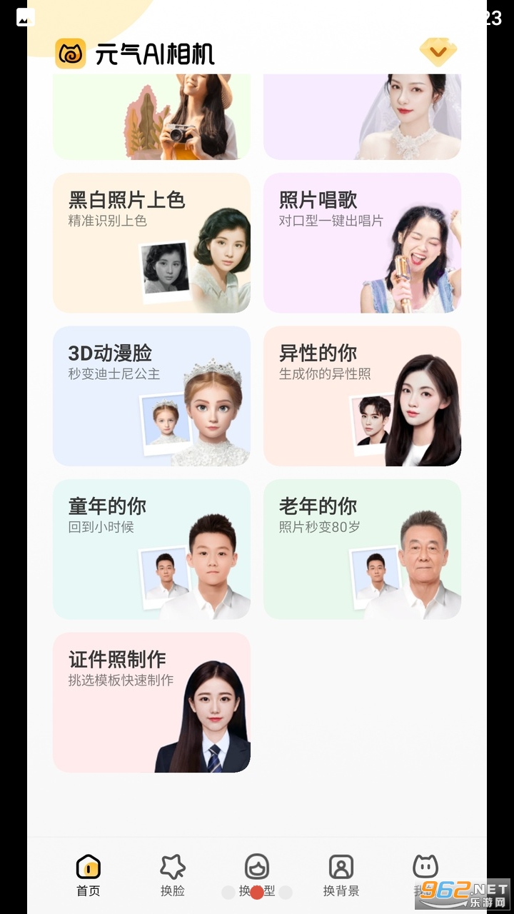 元气AI相机是基于AI算法的智能图像处理APP,可帮助你修复老照片破损,智能上色并大幅提升照片清晰度,;可一键分析脸型,实现换卡通脸、3D动漫脸异性脸、预测童年照、老年照等多种高级图片效果。