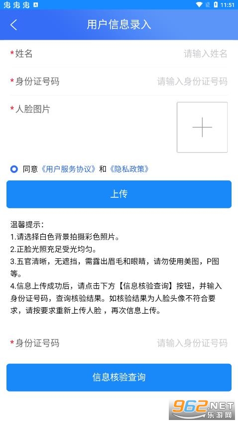 4、信息上传成功后,请点击下方【信息核验查询】按钮,并输入身份证号码,查询核验结果。如核验结果为人脸头像不符合要求,请按要求重新上传人脸,再次信息上传。