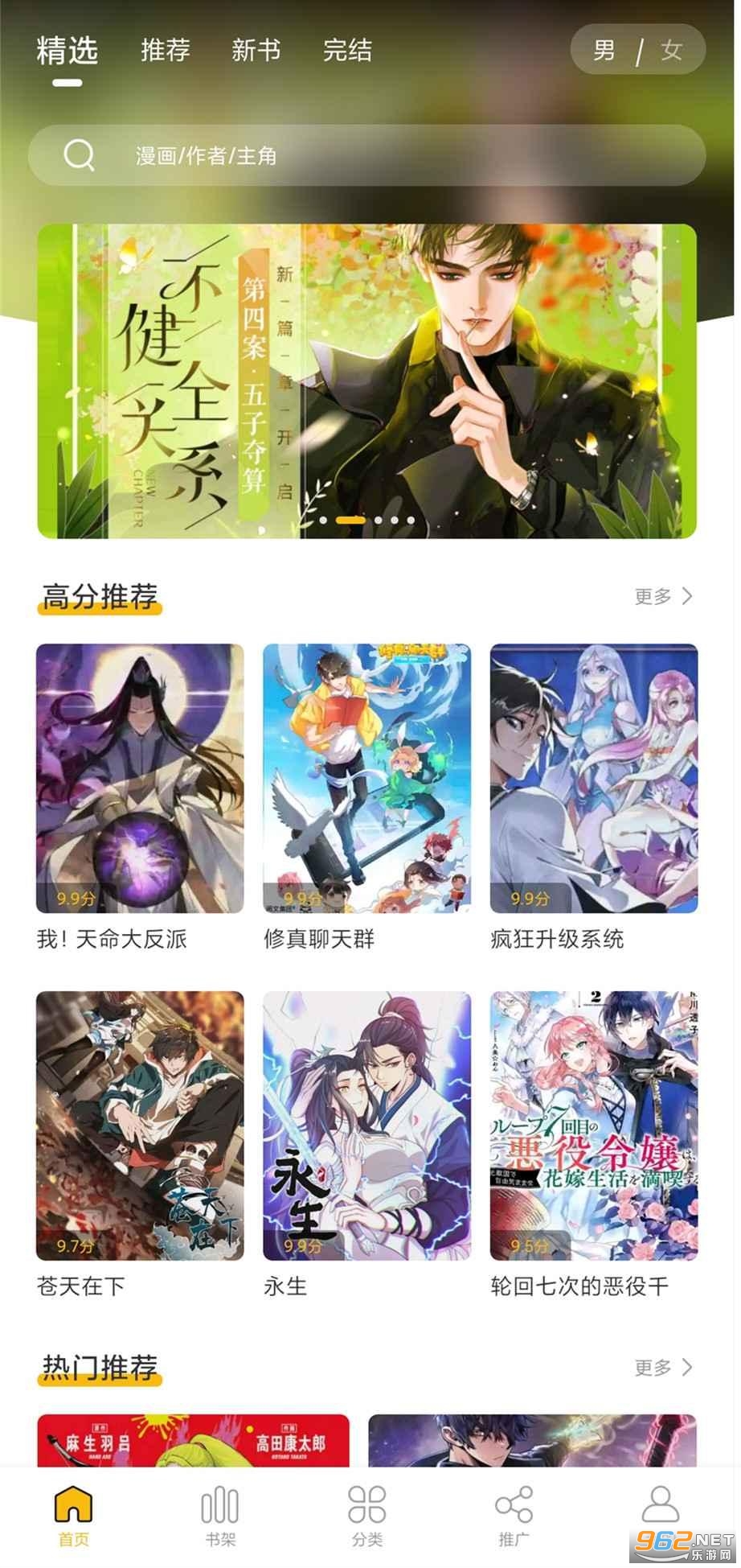 1、热门、高分作品都在首页,首页找不到就去分类看看,分类里也有很多很多类型,也有男女类型。
