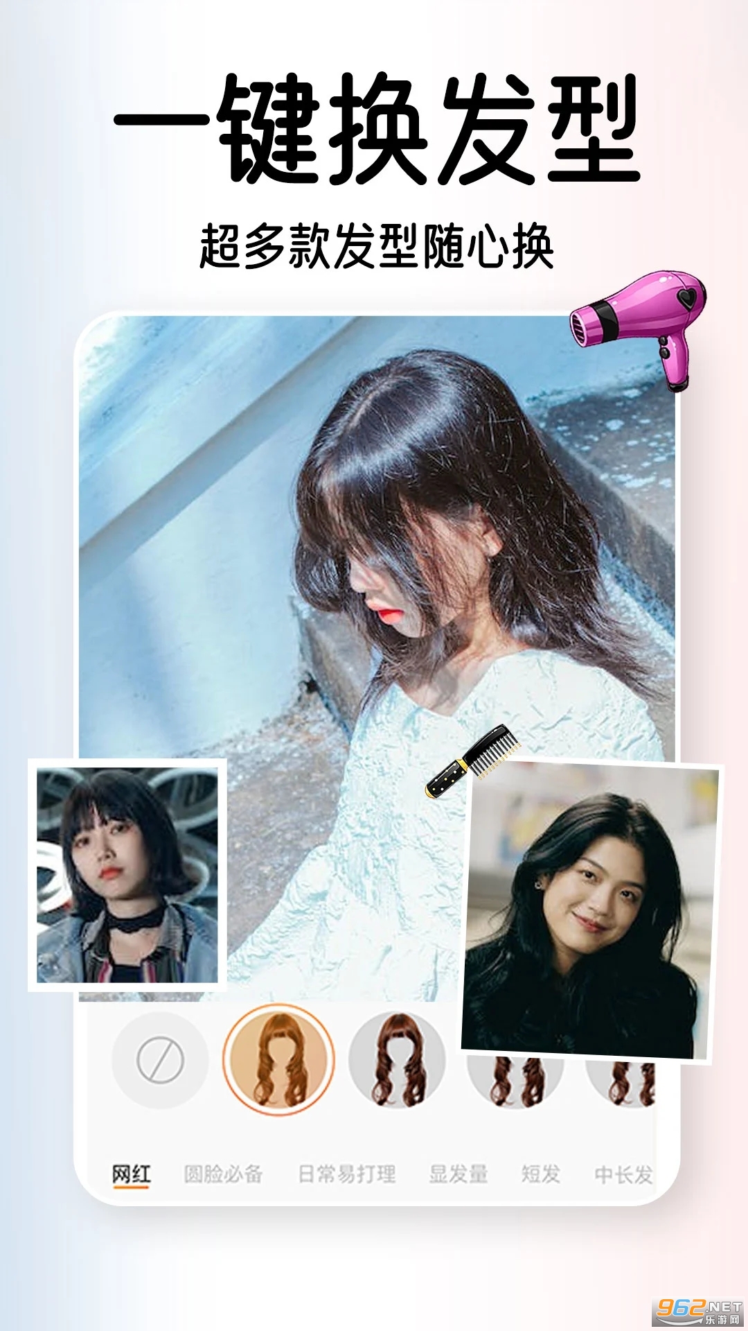 【百变发型随心挑】AI试发型APP内含多种美丽的发型,长发、中长发、短发、网红发型、发色任你挑选,马尾辫、新娘盘发、古装剧发饰、随意切换,还支持放大缩小和移动功能,让你随意调整,找到适合自己的角度!