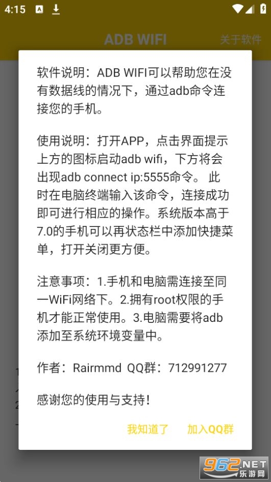 《ADBWIFI调试工具》一款功能齐全、实用的手机客户端,可以为用户带来多种体验和便利。软件支持arm和x86设备,适用于32位和64位系统,具有通用性,用户无需进行额外设置即可直接使用。用户可以通过软件快速进入开发者模式,方便快捷。软件提供了详细的使用说明和代码查询功能,让用户可以随时查询相关指令,提高使用效率。