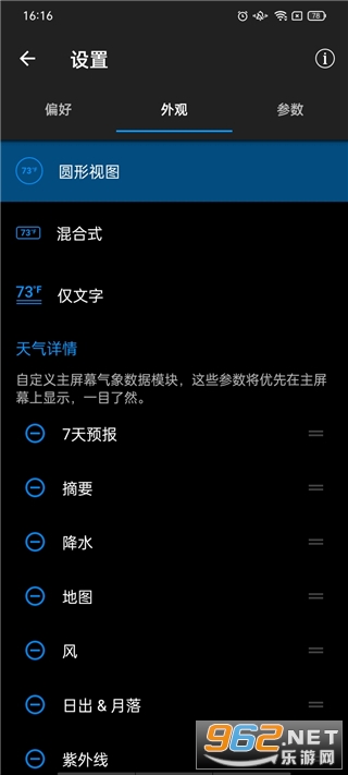2、自定义布局。选择要在界面布局设置中显示的天气参数。