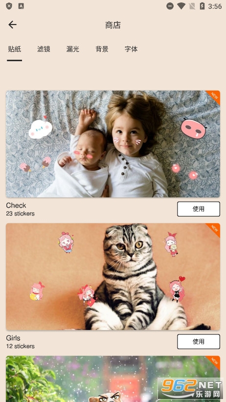 使用 90 种效果编辑照片(泄漏、旧照片图案、彩虹、雪花等)。