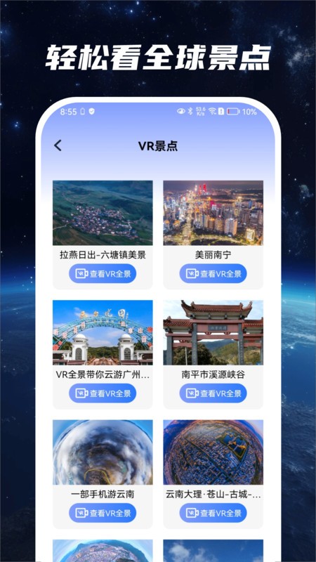 星云地球app能够在家里面云看全世界景点,轻松看vr美景,支持的地点广泛,包含的数据丰富,全球风光一览无余,支持查看3d地图,通过ar扫描课本还能查看对应的三维地图,形象直观,还能看实景街景图,出门在外也可以查看家乡街景!