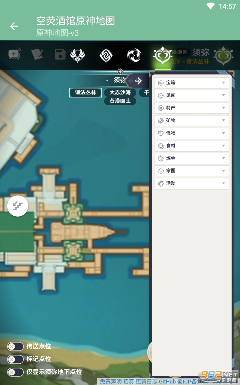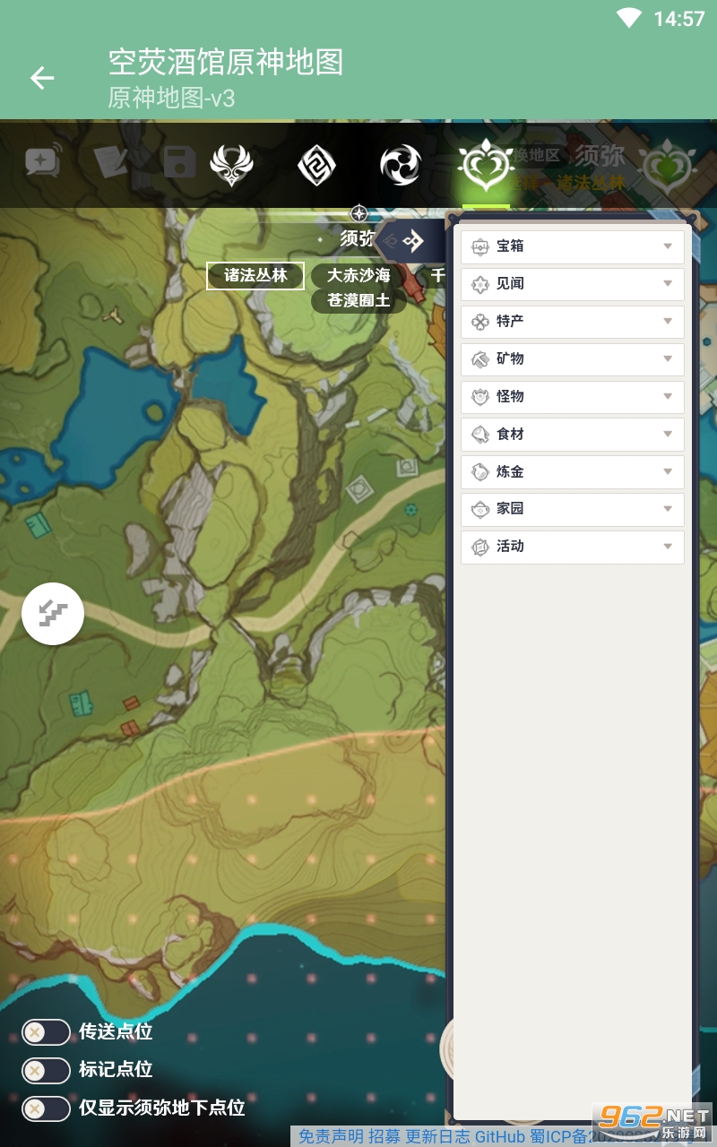3.原神WIKI地图工具查看左侧有所有地图物品.事件.神瞳等等的筛选。