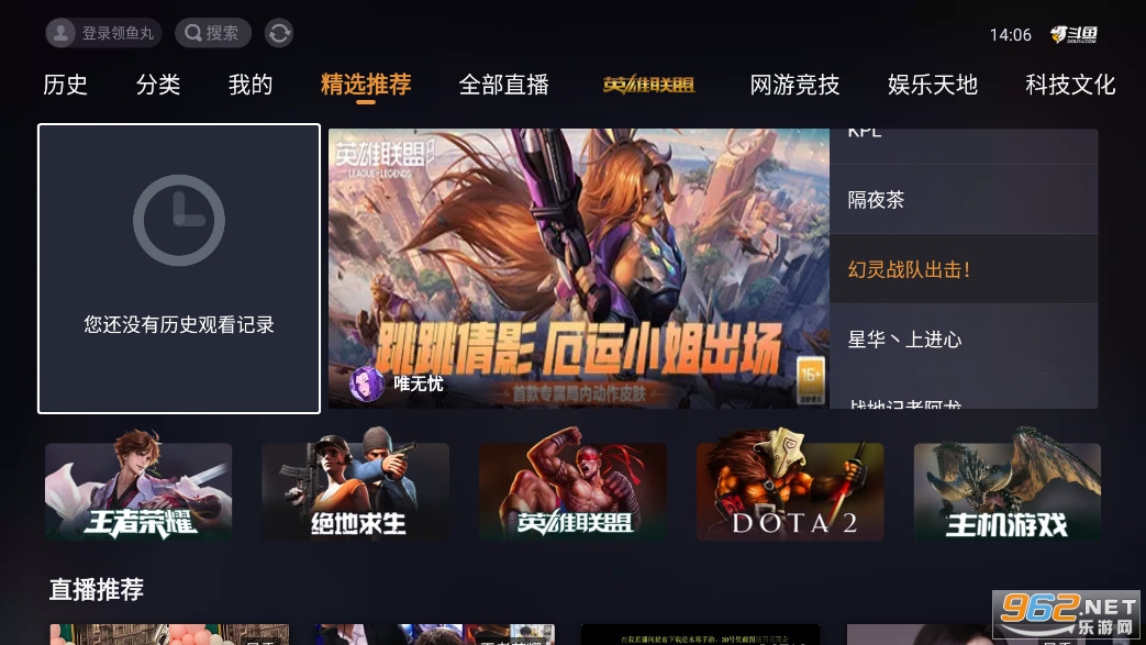 提供高清、快捷、流畅的视频直播和游戏赛事直播服务,TV端包含英雄联盟lol直播、穿越火线cf直播、dota2直播、教育正能量等多种直播内容。