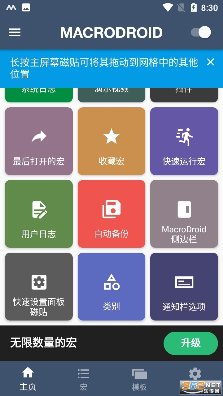 一款功能强大的任务自动化和配置应用程序。它拥有简约易用的界面和直观的配置过程,让用户可以轻松创建、编辑和管理宏。用户可以列出宏并查看其详细信息,还可以根据自己的需求自定义设置宏的预览模板。此外,Macrodroid还提供了强大的设置功能,包括根功能、通知栏选项、系统日志、编辑类别、模式、变量、语言、触发设置和动作选项等。通过该应用,用户可以优化手机的工作流程,减少电池消耗,节省漫游成本,并使用计时器和秒表提醒完成任务。
