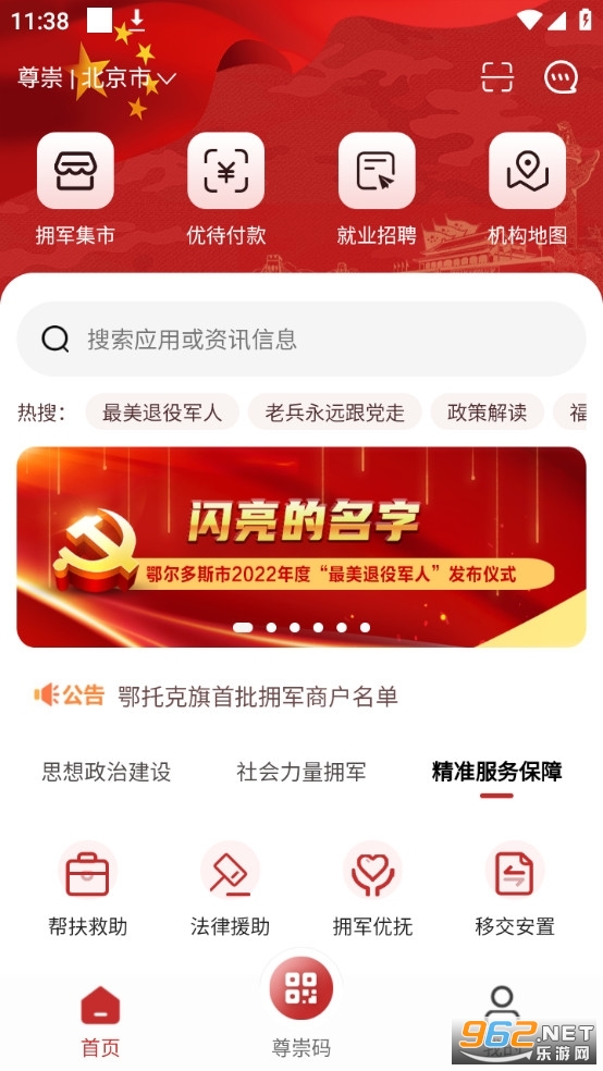 尊崇app是鄂尔多斯市退役军人服务中心为退伍老兵们准备的福利软件,主要的功能板块内容很多,比如思想政治建设,社会力量拥军、精准服务保障、拥军集市、积分商城、法律救助、拥军优抚、帮扶救助等等,是一款可以让老兵们感到温暖的软件。