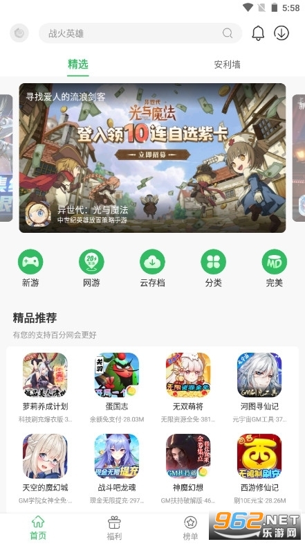 百分网游游盒4.3.6版本为广大玩家提供单机大作,BT网游,礼包福利,游戏点播,编辑推荐等专栏,以绿色免费为基础,更有游戏供玩家娱乐,让你嗨到爆!