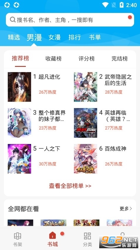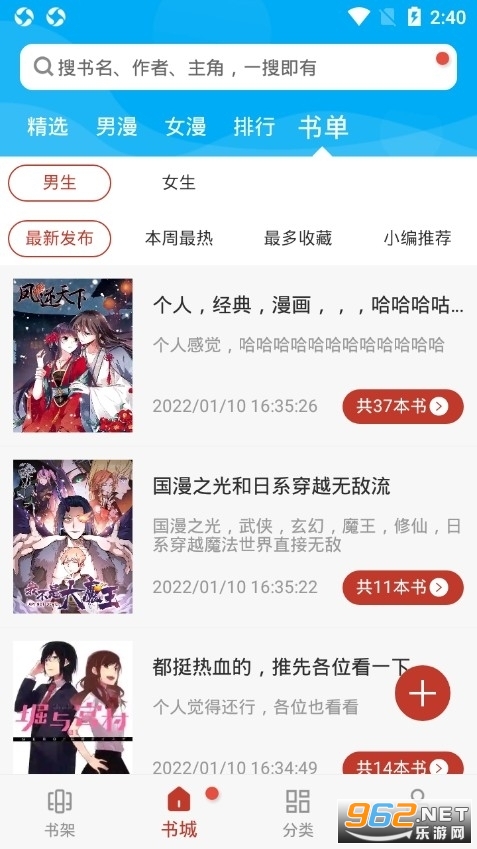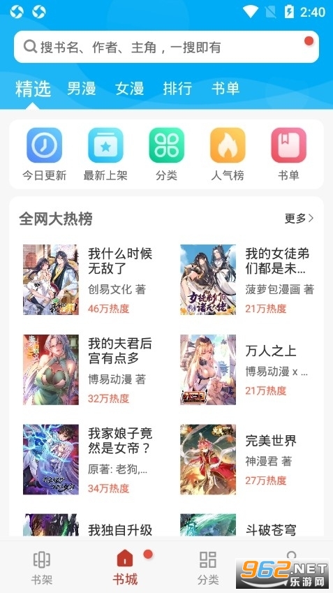 3、进入软件可以看到,书城栏里有四个小分类,精选、男漫、女漫和书单。精选栏里有推荐榜、人气榜、书单、热门连载等小功能;男漫、女漫、书单、分类里都是类似的功能,这里就不详细介绍了。漫画小说的分类也比较详细,各种类型的小说漫画这里都可以找到,完全能够满足大家日常的阅读需求。