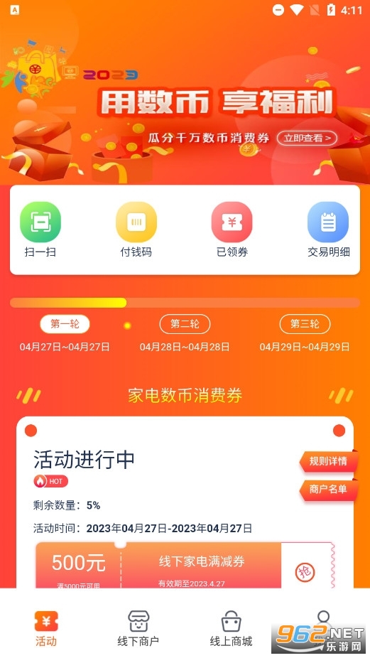 数字人民币促销费活动软件,可以通过软件领取各种消费券,享受到最优质的服务,支付时直接选择消费券,享受便捷无比的福利,查看支付交易的详细情况。