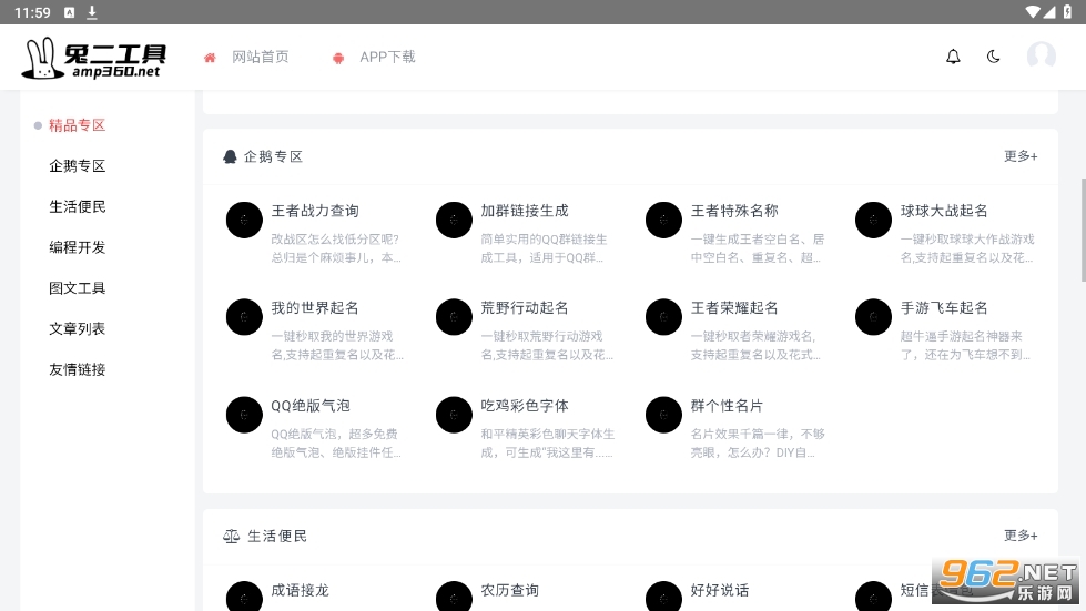 兔二工具是一个集合了众多在线工具的神奇工具箱,集齐了短视频解析、音乐下载解析、风水测算、编程开发、王者空白名等超多小工具!功能全面,囊括了所有好玩软件的亮点功能。其目的仅仅是为了满足自己的日常使用需求,同时又能给到需要用的人。