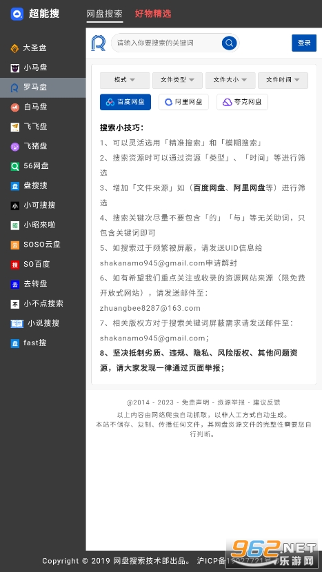 超能搜是一个网盘搜索聚合搜索网站,本身不提存储和搜索,仅调用其他知名网盘搜索引擎的界面,为用户提供界面简洁的网盘搜索服务。