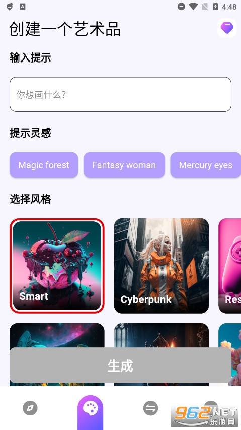 输入提示,选择一种艺术风格,剩下的交给AI画家,几秒钟之内将您的想法变成令人着迷的艺术品!